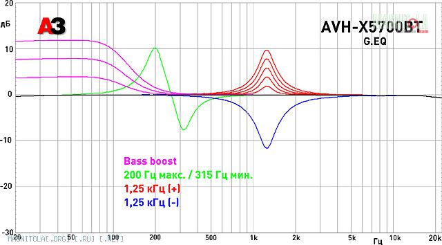 Эквалайзер – графический 13-полосный, ряд частот — 2/3 октавный ряд: 50, 80, 125 и так далее до 12,5 кГц.